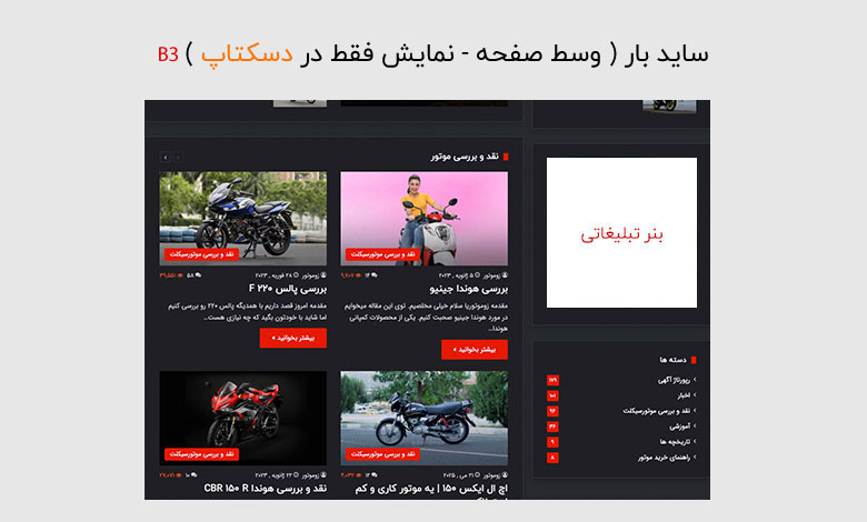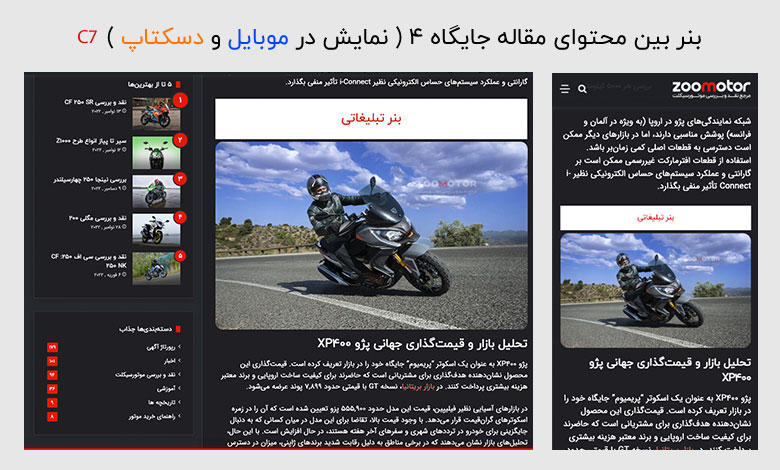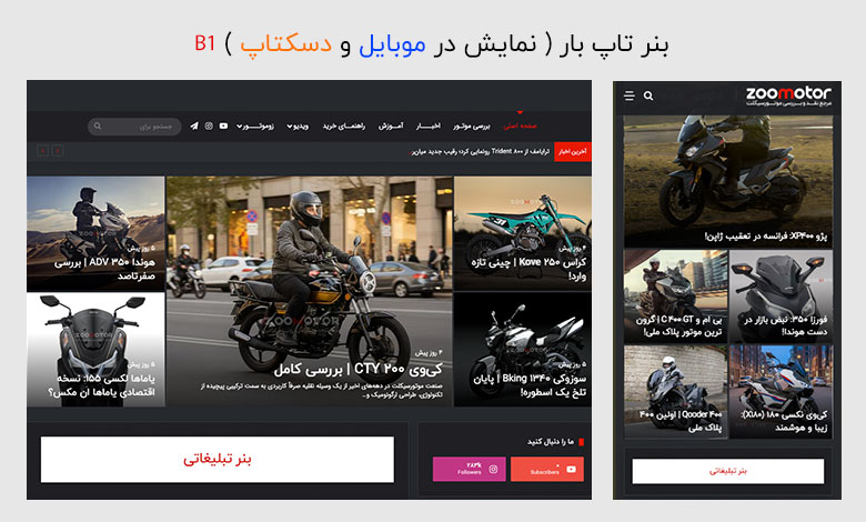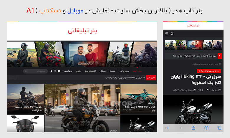 تبلیغات بنری در زوموتور صرفاً نمایش یک تصویر نیست، بلکه قرارگیری برند شما در کانون توجه تخصصی‌ترین جامعه موتورسواری ایران است. با توجه به اینکه مخاطبان ما دقیقاً با هدف جستجو، بررسی و خرید در دنیای موتورسیکلت وارد سایت می‌شوند، بنر شما در معرض دید افرادی قرار می‌گیرد که هم‌اکنون در “چرخه خرید و انتخاب” هستند. این یعنی نرخ کلیک بالاتر و جذب مخاطبی که به دنبال خدمات و محصولات شماست، نه یک کاربر گذری و بی‌هدف.